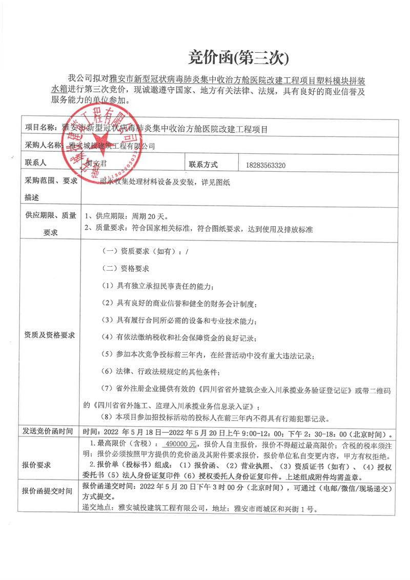 雅安市新型冠狀病毒肺炎集中收治方艙醫(yī)院改建工程項(xiàng)目塑料模塊拼裝水箱競價(jià)函(第三次)