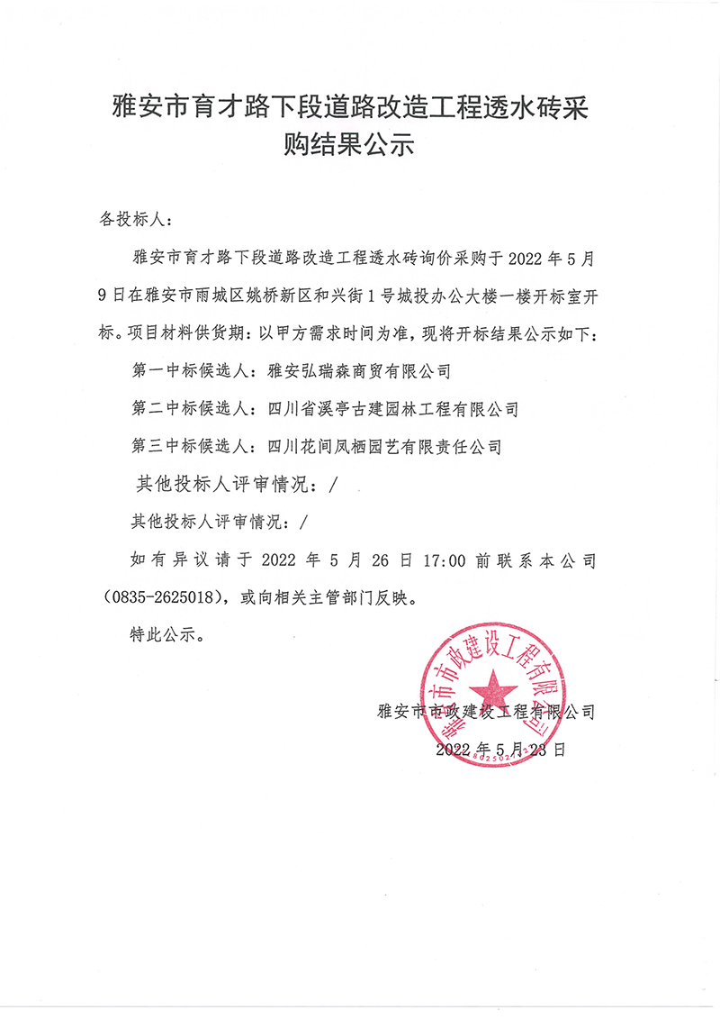 雅安市育才路下段道路改造工程透水磚采購(gòu)結(jié)果公示