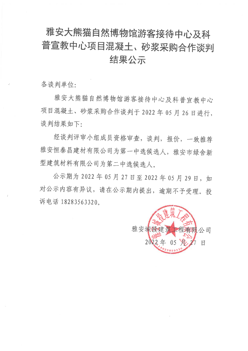 雅安大熊貓自然博物館游客接待中心及科普宣教中心項目混凝土、砂漿采購合作談判結(jié)果公示