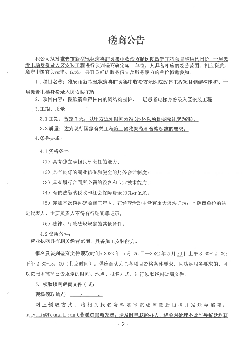 雅安市新型冠狀病毒肺炎集中收治方艙醫(yī)院改建工程項(xiàng)目鋼結(jié)構(gòu)圍護(hù)、一層患者電梯身份錄入?yún)^(qū)安裝工程采購(gòu)