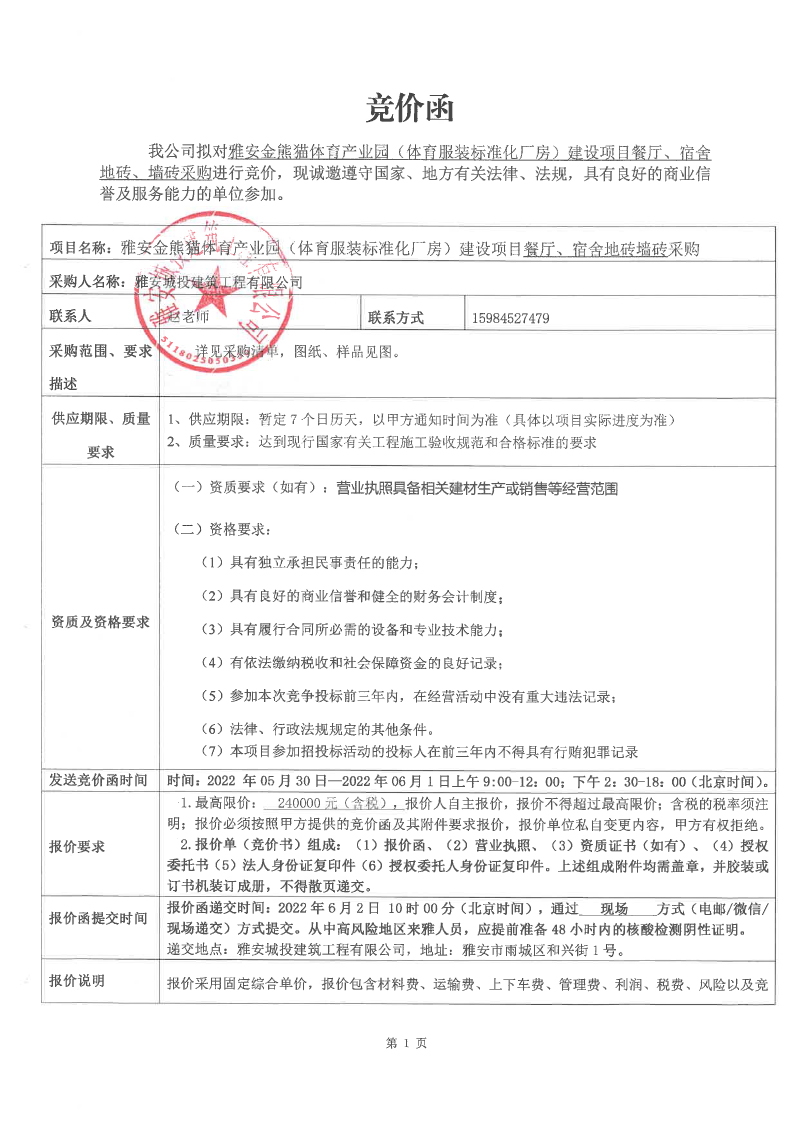雅安金熊貓?bào)w育產(chǎn)業(yè)園(體育服裝標(biāo)準(zhǔn)化廠房)建設(shè)項(xiàng)目餐廳、宿舍地磚、墻磚競(jìng)價(jià)采購(gòu)