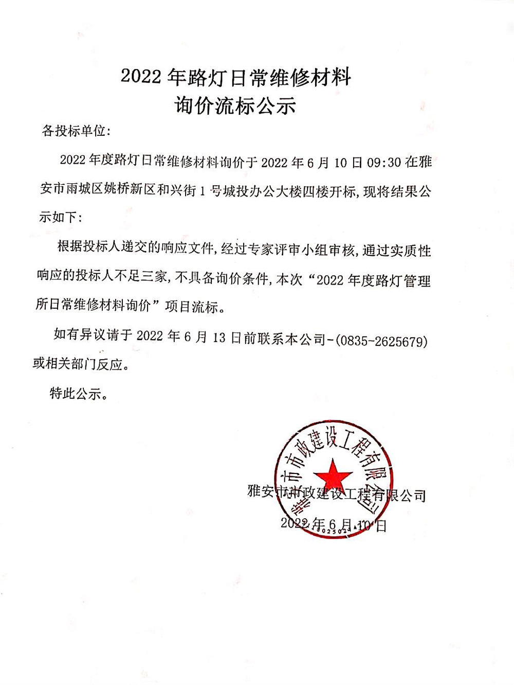 2022年路燈日常維修材料詢價流標公示