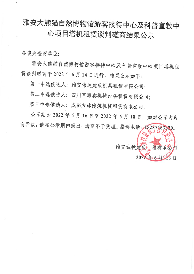 雅安大熊貓自然博物館游客接待中心及科普宣教中心項目塔機租賃談判磋商結(jié)果公示