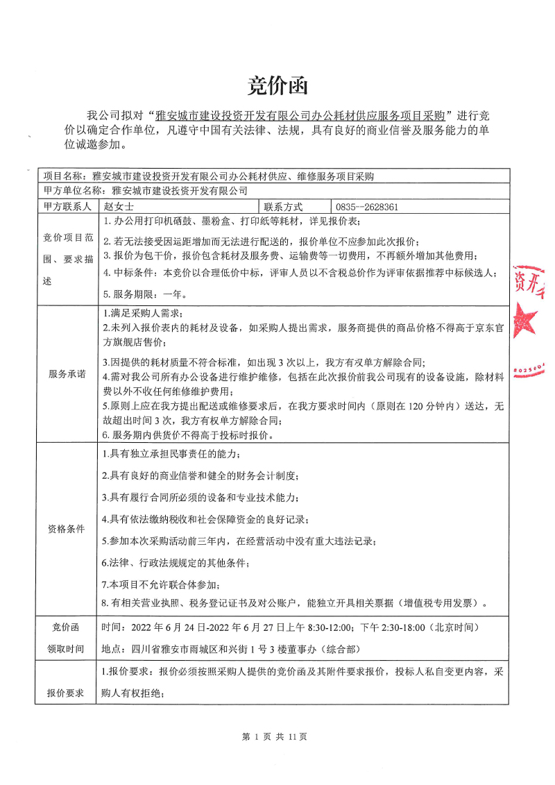 雅安城市建設(shè)投資開發(fā)有限公司 辦公耗材供應(yīng)、維修服務(wù)項(xiàng)目采購競價公告