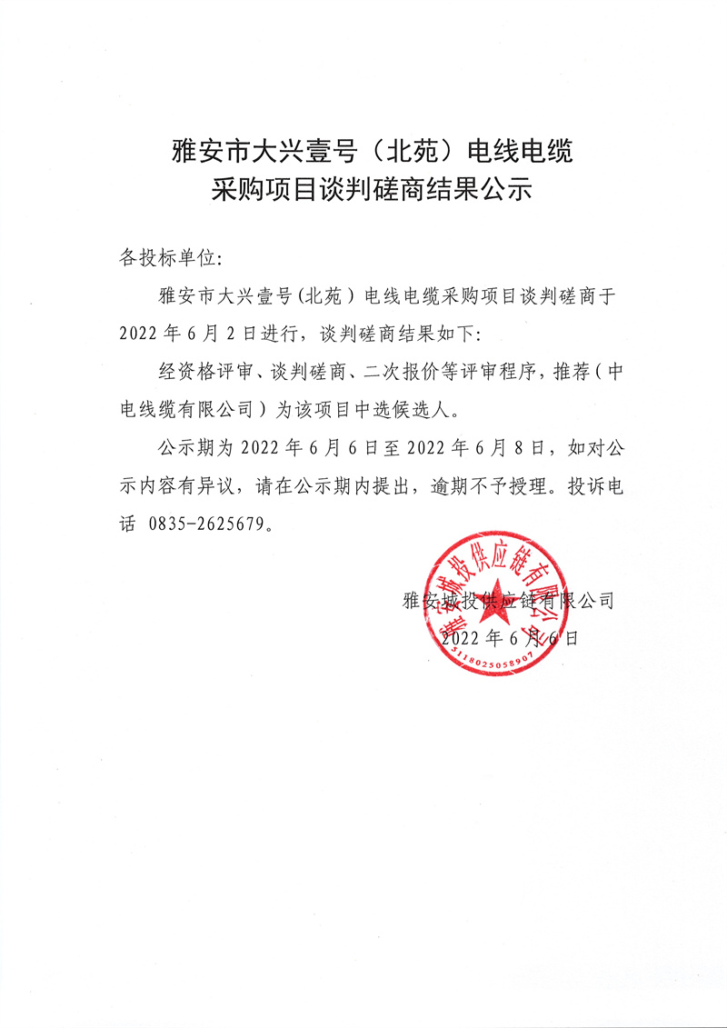 雅安城投供應鏈有限公司大興壹號(北苑)項目電線電纜談判磋商結(jié)果公示