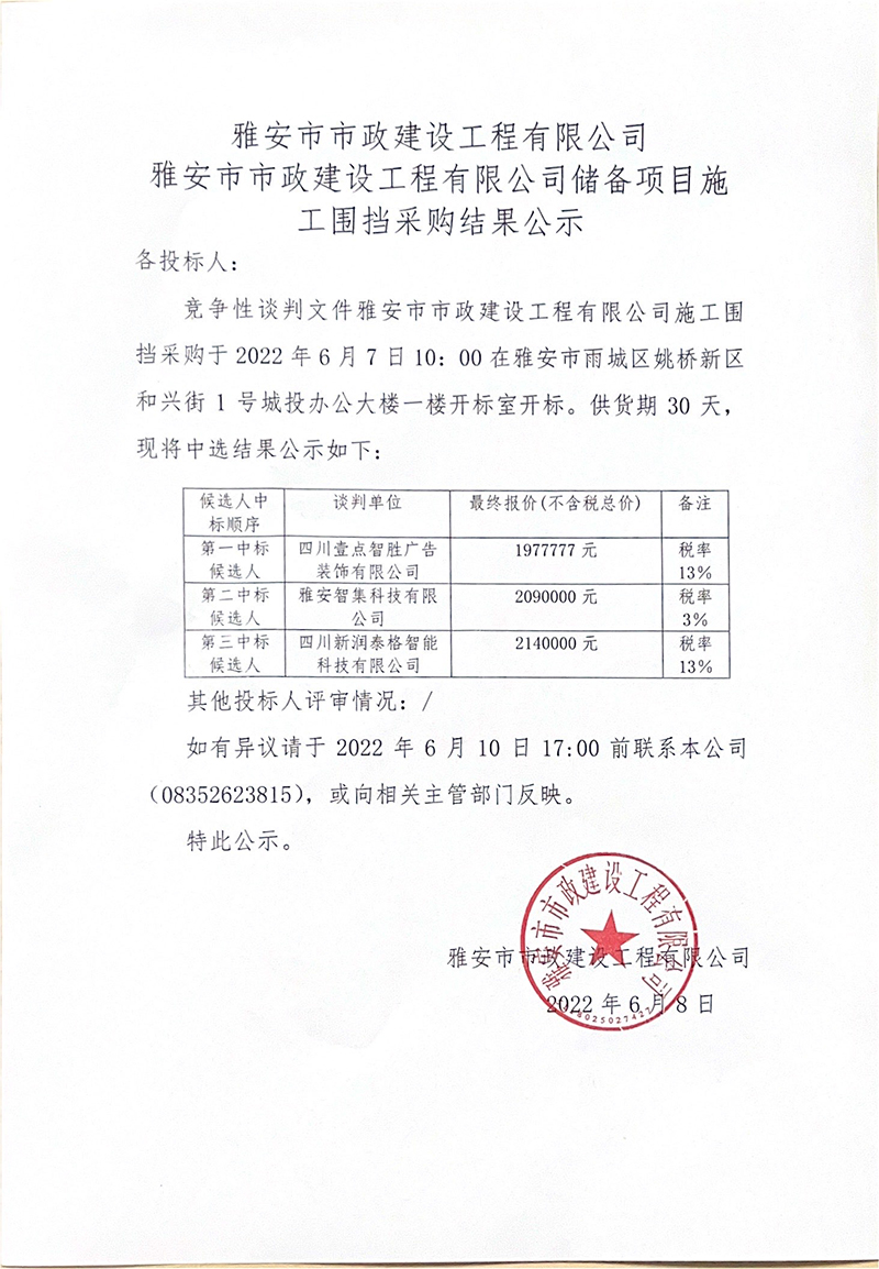 雅安市市政建設工程有限公司儲備項目施工圍擋招采結果公示