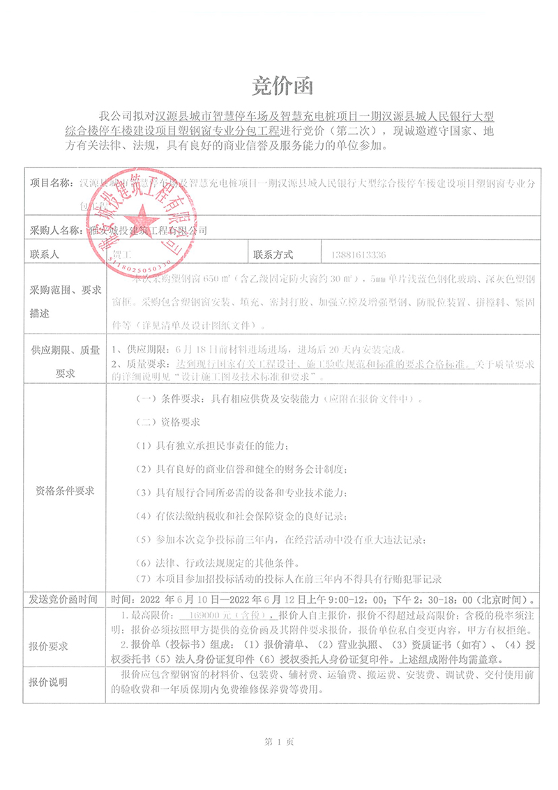漢源縣城市智慧停車場及智慧充電樁項目一期漢源縣城人民銀行大型綜合樓停車樓建設項目塑鋼窗專業(yè)分包工程競價采購競價公告