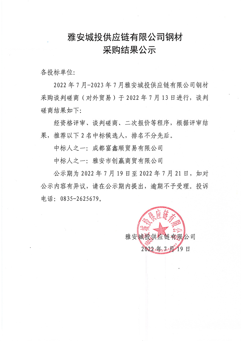 雅安城投供應(yīng)鏈有限公司鋼材采購結(jié)果公示