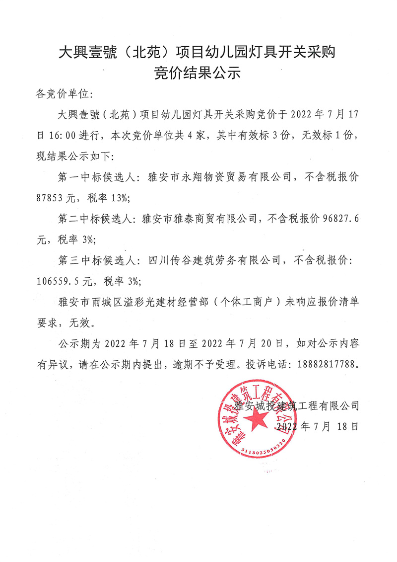 大興壹號(北苑)項(xiàng)目幼兒園燈具開關(guān)競價(jià)結(jié)果公示