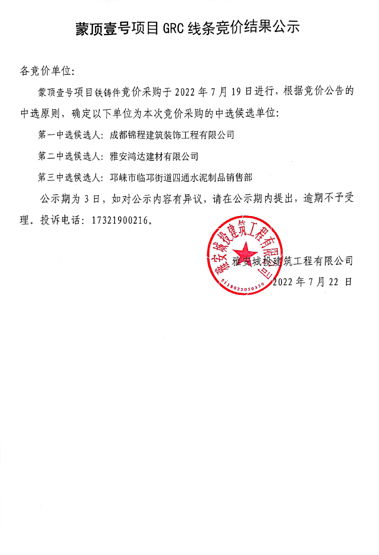 蒙頂壹號項目GRC線條競價結(jié)果公示