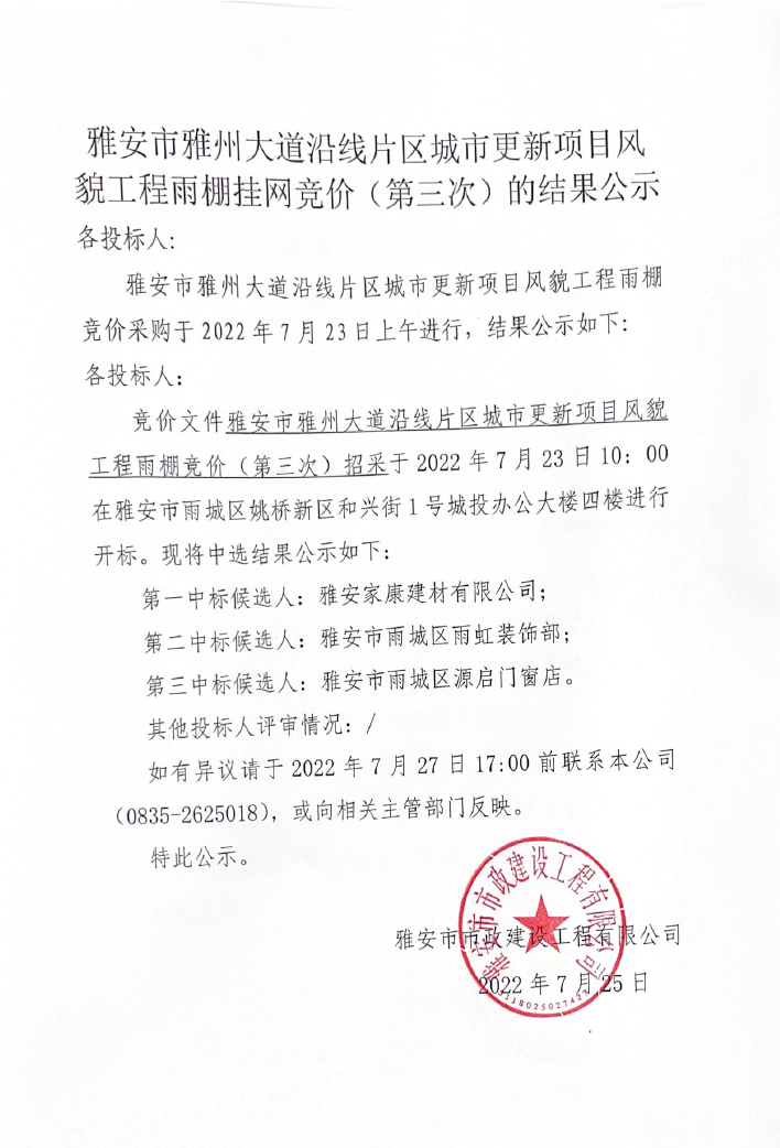 雅安市雅州大道沿線片區(qū)城市更新項目風貌工程雨棚競價(第三次)的結果公示