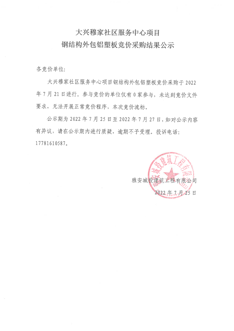 大興穆家社區(qū)服務(wù)中心項(xiàng)目鋼結(jié)構(gòu)外包鋁塑板競(jìng)價(jià)采購(gòu)結(jié)果公示