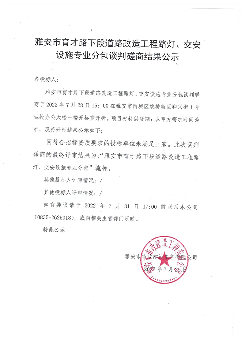 雅安市育才路下段道路改造工程路燈、交安設施專業(yè)分包談判磋商結(jié)果公示