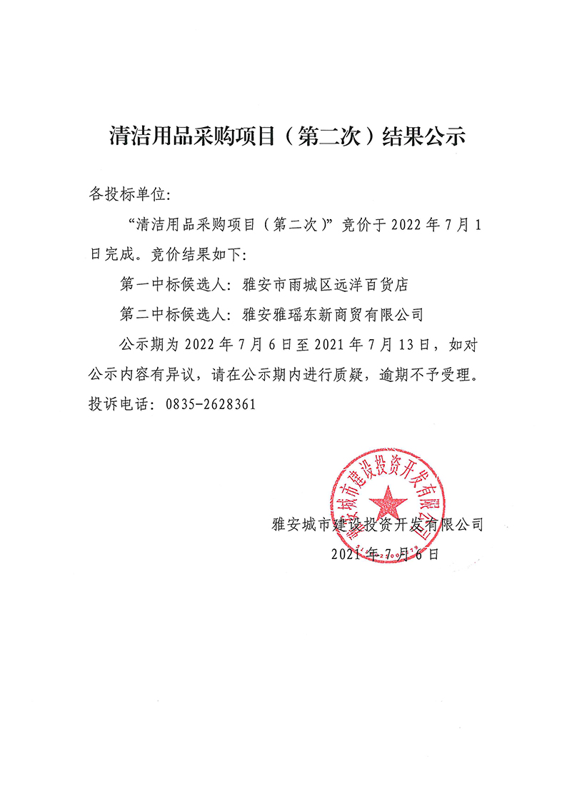 雅安城市建設(shè)投資開發(fā)有限公司清潔用品采購項目(第二次)結(jié)果公示