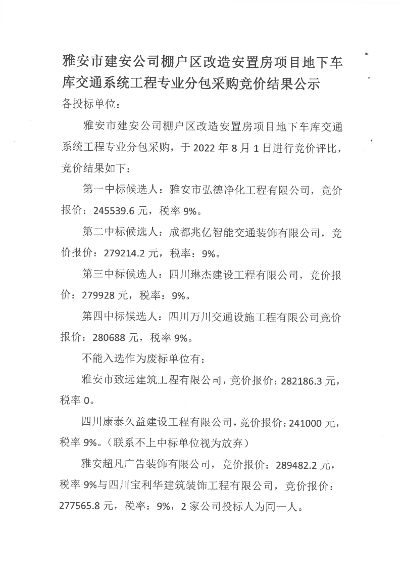 雅安市建安公司棚戶區(qū)改造安置房項(xiàng)目地下車庫交通系統(tǒng)工程專業(yè)分包競價(jià)結(jié)果公示