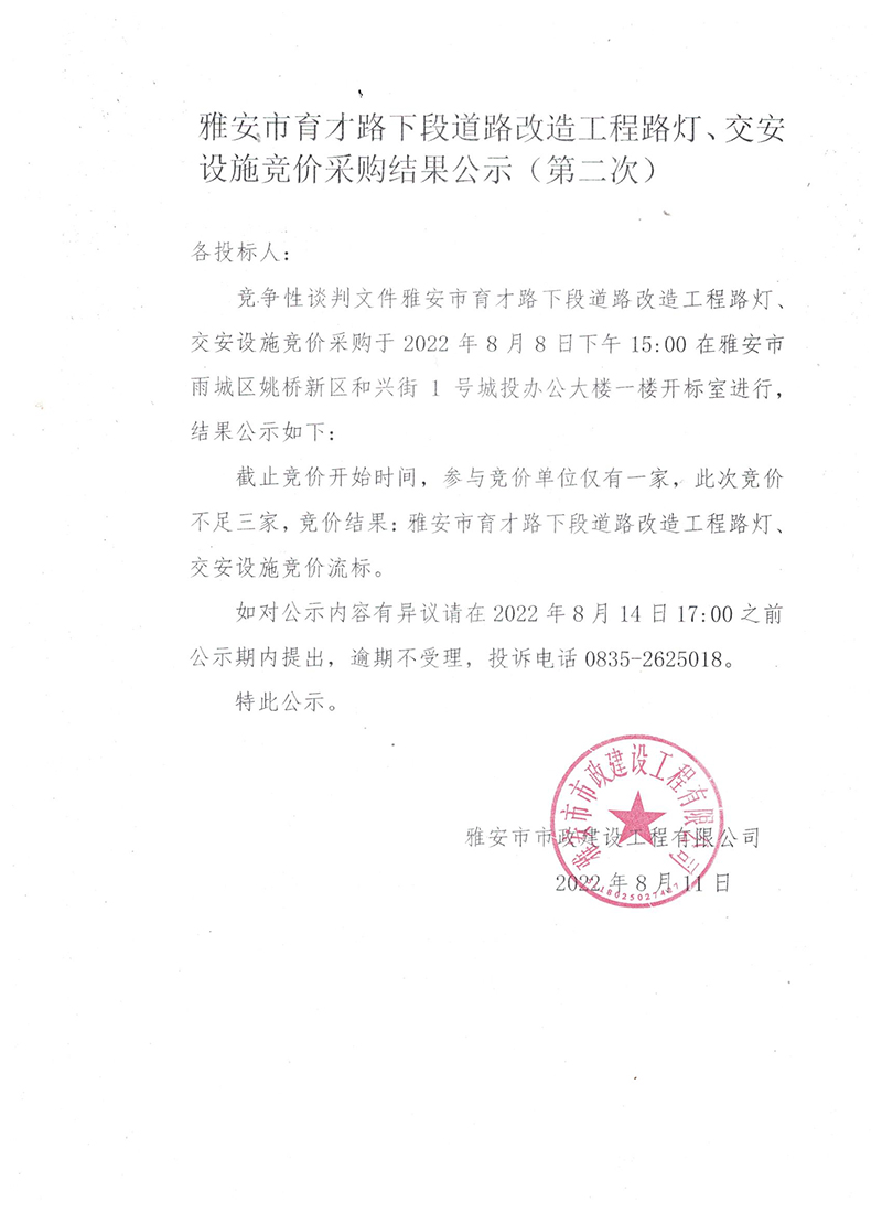 雅安市育才路下段道路改造工程路燈、交安設施競價采購結(jié)果公示(第二次)