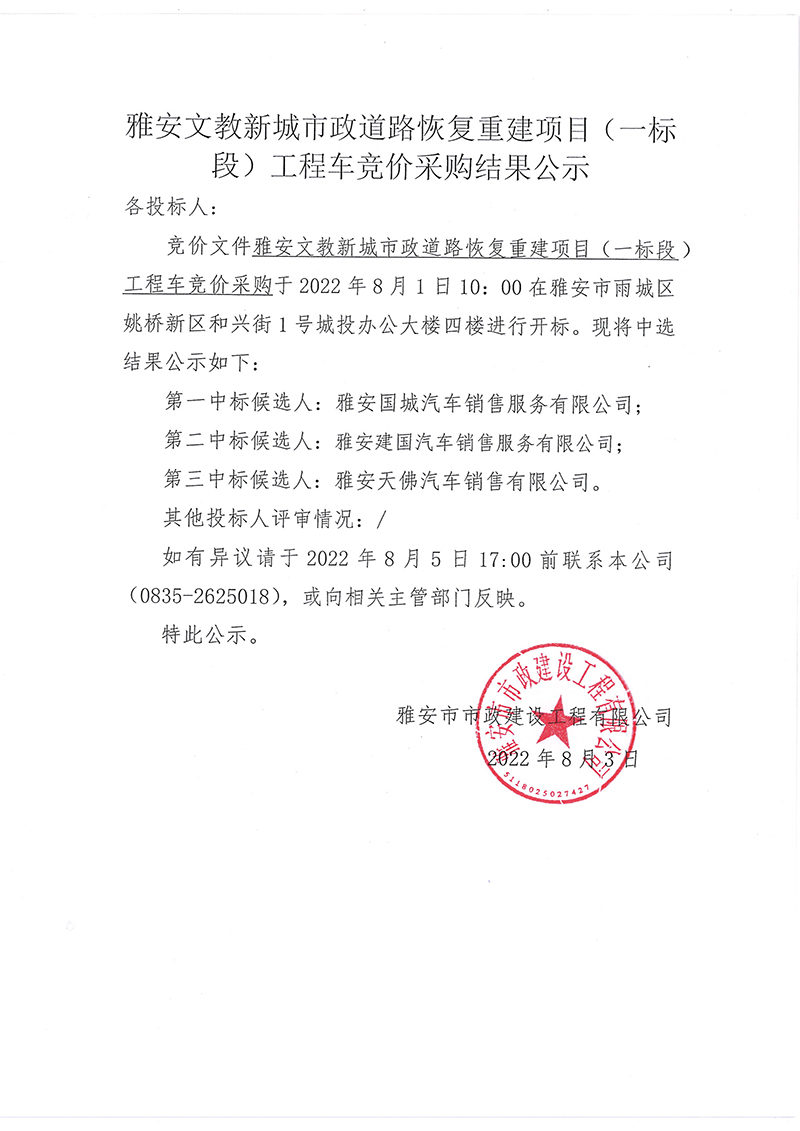 雅安文教新城市政道路恢復(fù)重建項(xiàng)目(一標(biāo)段)工程車競(jìng)價(jià)采購(gòu)結(jié)果公示