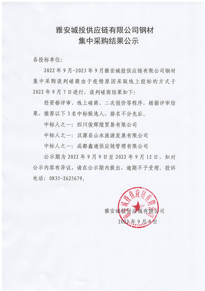 雅安城投供應(yīng)鏈有限公司鋼材集中采購結(jié)果公示
