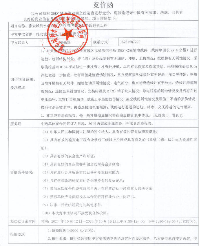 雅安城利水電公司35KV禁飛線雙回全線巡查工程競(jìng)價(jià)公告