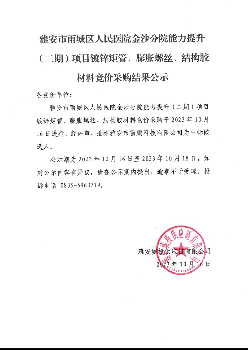 雅安市雨城區(qū)人民醫(yī)院金沙分院能力提升(二期)項目鍍鋅矩管、膨脹螺絲、結構膠材料競價采購結果公示