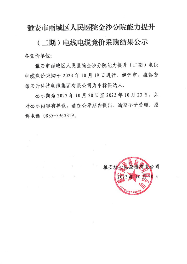 雅安市雨城區(qū)人民醫(yī)院金沙分院能力提升(二期)電線電纜競(jìng)價(jià)采購結(jié)果公示