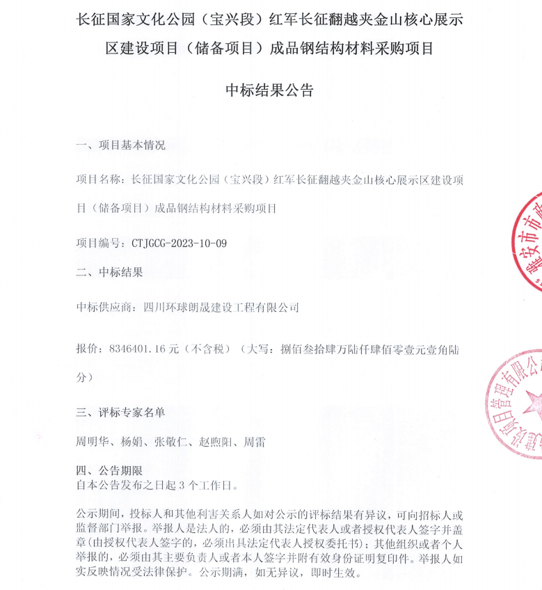 長(zhǎng)征國(guó)家文化公園(寶興段)紅軍長(zhǎng)征翻越夾金山核心展示區(qū)建設(shè)項(xiàng)目(儲(chǔ)備項(xiàng)目)成品鋼結(jié)構(gòu)材料采購(gòu)項(xiàng)目中標(biāo)結(jié)果公告