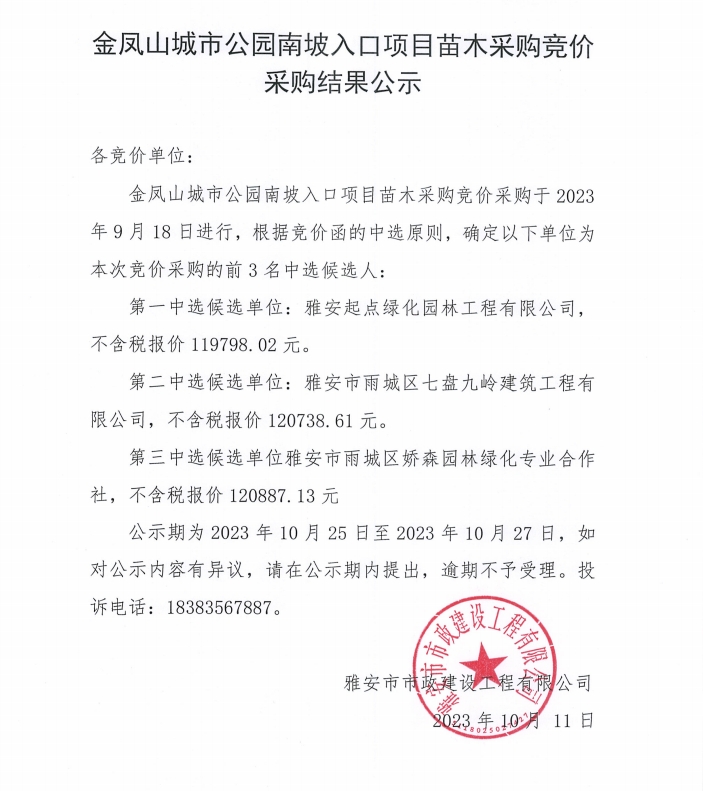 金鳳山城市公園南坡入口項(xiàng)目苗木采購競價采購結(jié)果公示