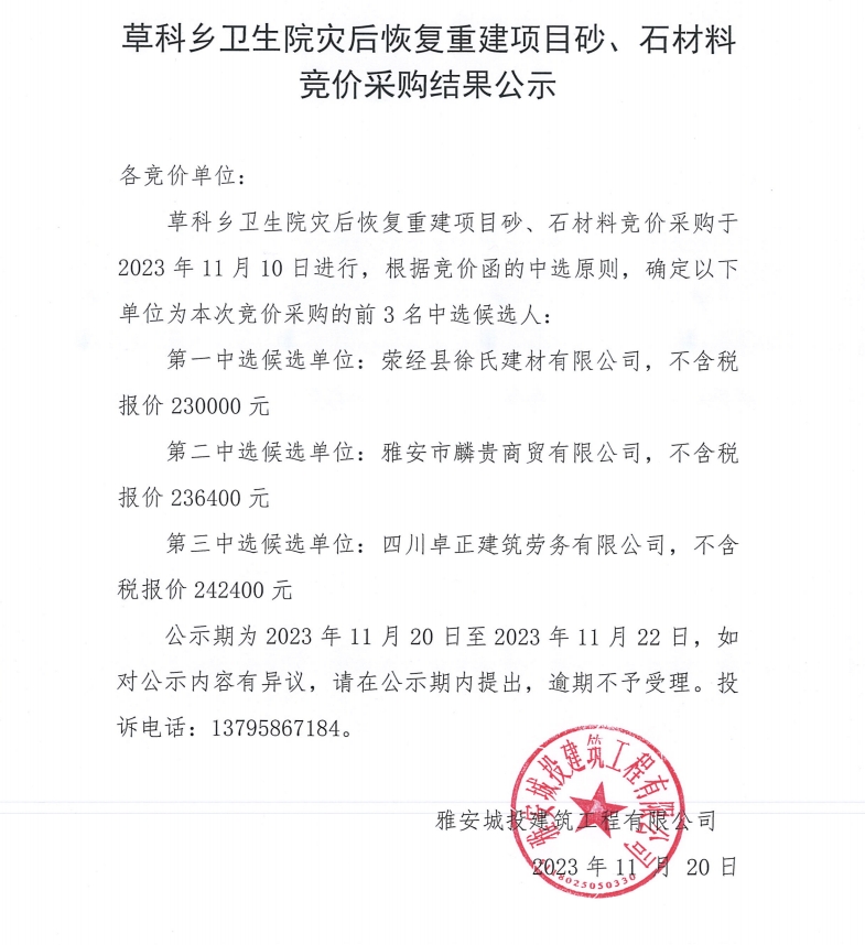 草科鄉(xiāng)衛(wèi)生院災(zāi)后恢復(fù)重建項(xiàng)目砂、石材料競(jìng)價(jià)采購結(jié)果公示