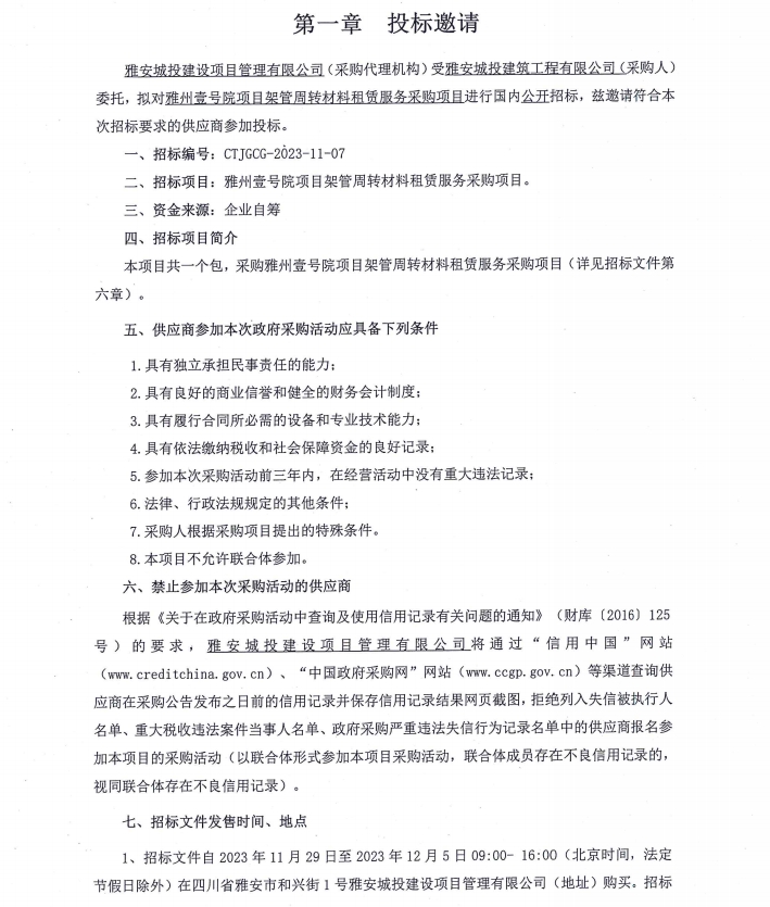 雅州壹號院項目架管周轉(zhuǎn)材料租賃服務(wù)采購項目投標邀請公告