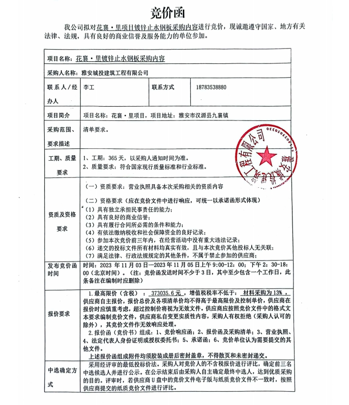 花襄·里項(xiàng)目鍍鋅止水鋼板采購內(nèi)容競價(jià)公告