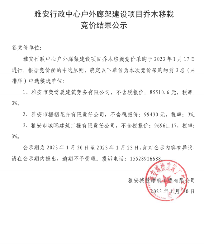 雅安行政中心戶外廊架建設(shè)項目喬木移栽競價結(jié)果公示
