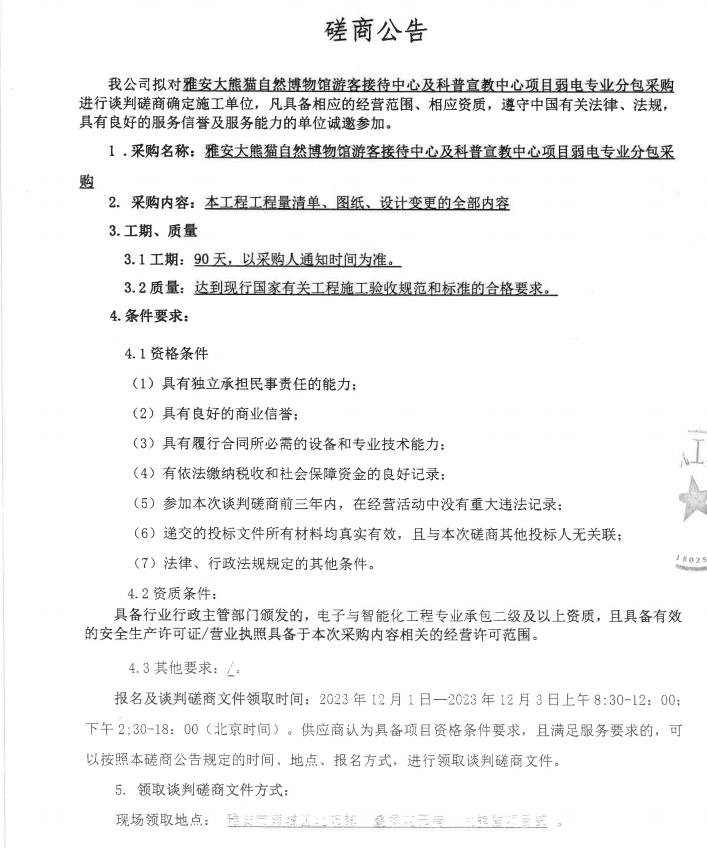 雅安大熊貓自然博物館游客接待中心及科普宣教中心項(xiàng)目弱電專業(yè)分包采購(gòu)談判磋商公告