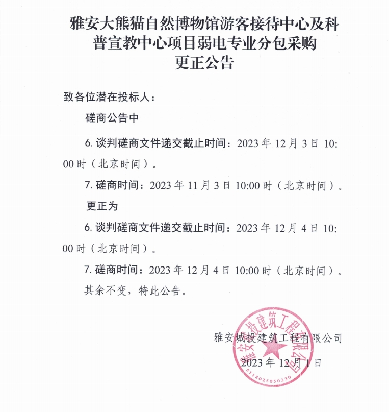 雅安大熊貓自然博物館接待中心及科普宣教中心項(xiàng)目弱電專業(yè)分包采購更正公告