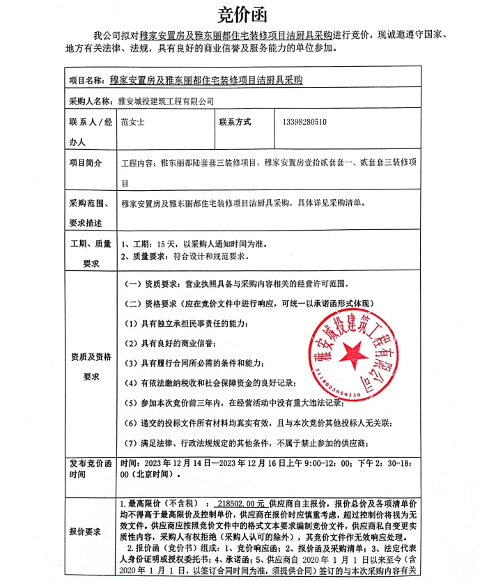 穆家安置房及雅東麗都住宅裝修項(xiàng)目潔廚具采購競價(jià)公告