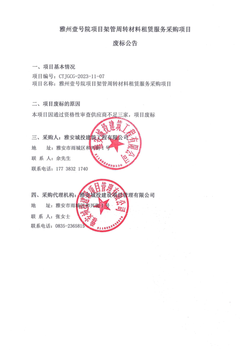 雅州壹號項目架管周轉(zhuǎn)材料租賃服務(wù)采購項目廢標公告