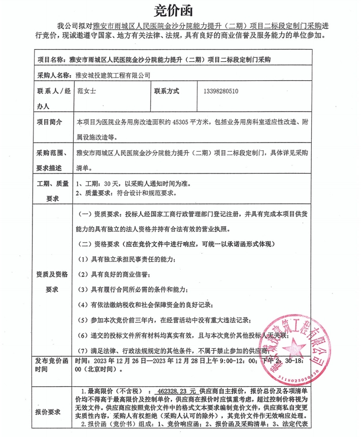 雅安市雨城區(qū)人民醫(yī)院金沙分院能力提升(二期)項(xiàng)目二標(biāo)段定制門采購競價(jià)公告