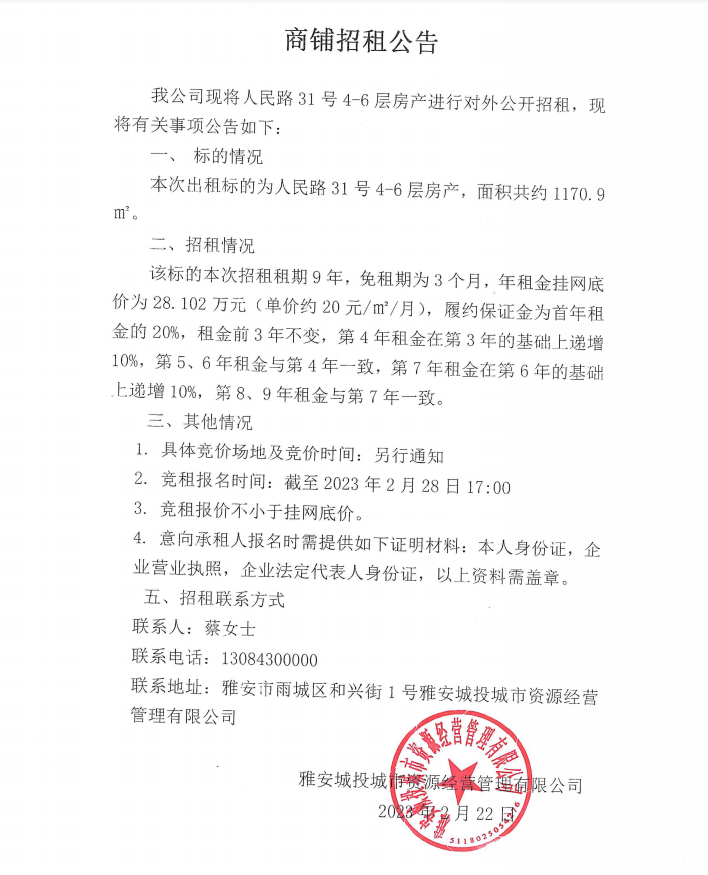 人民路31號4-6層房產(chǎn)招租公告