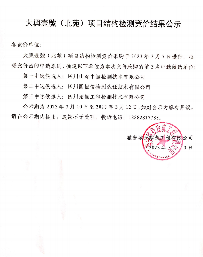大興壹號(hào)(北苑)項(xiàng)目結(jié)構(gòu)檢測競價(jià)結(jié)果公示