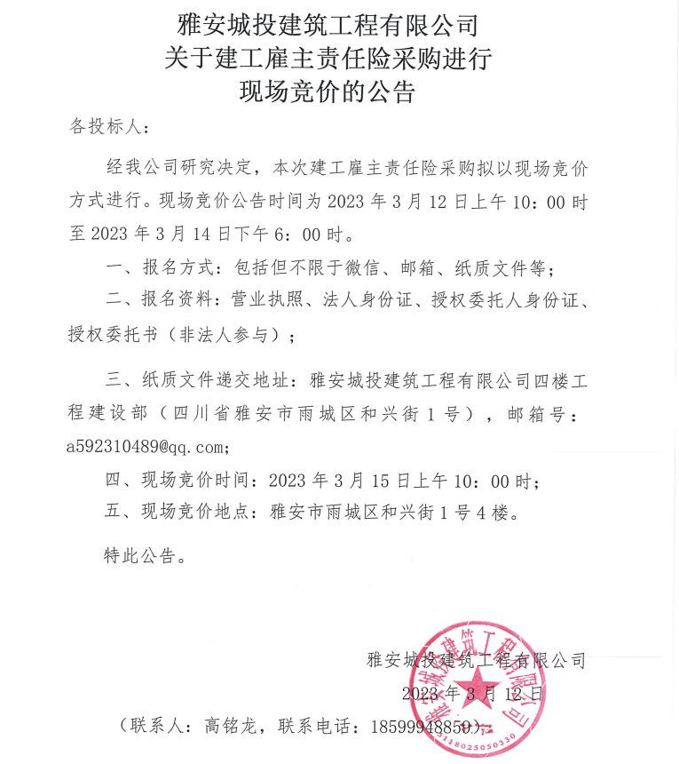 雅安城投建筑工程有限公司關(guān)于建工雇主責(zé)任險(xiǎn)采購進(jìn)行現(xiàn)場競價(jià)的公告