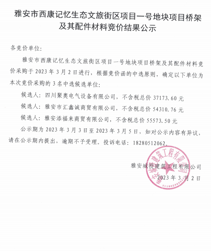 雅安市西康記憶生態(tài)文旅街區(qū)項(xiàng)目一號(hào)地塊項(xiàng)目橋架及其配件材料競價(jià)結(jié)果公示