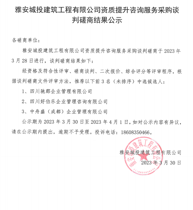 雅安城投建筑工程有限公司資質提升咨詢服務采購談判磋商結果公示