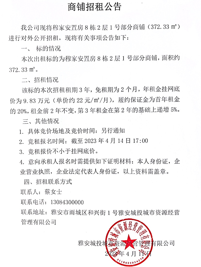 穆家安置房8棟2層1號部分商鋪招租公告