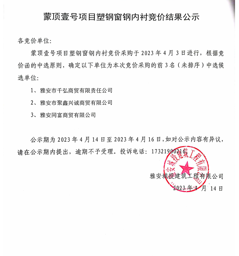 蒙頂壹號(hào)項(xiàng)目塑鋼窗內(nèi)襯競價(jià)結(jié)果公示