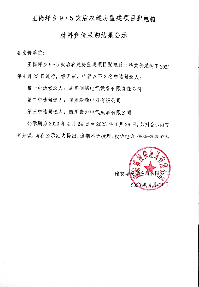 王崗坪鄉(xiāng)9·5災(zāi)后農(nóng)建房重建項(xiàng)目配電箱材料競(jìng)價(jià)采購結(jié)果公示