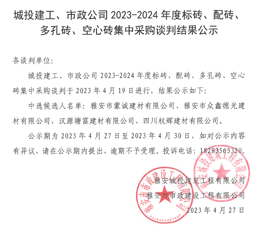 城投建工、市政公司2023-2024年度標磚、配磚、多孔磚、空心磚集中采購談判結(jié)果公示