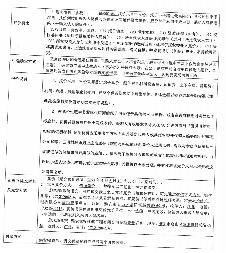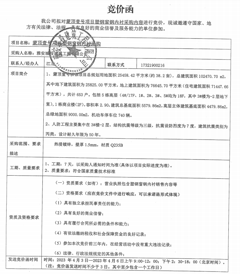 蒙頂壹號(hào)項(xiàng)目塑鋼窗鋼內(nèi)襯采購內(nèi)容競價(jià)公告