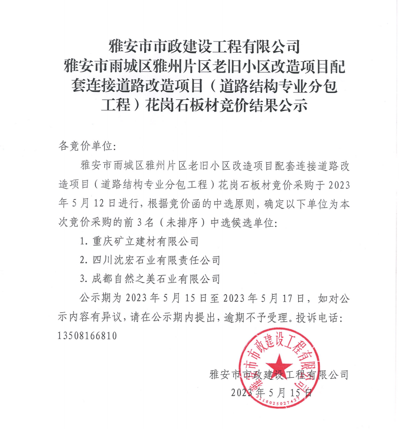 雅安市市政建設工程有限公司雅安市雨城區(qū)雅州片區(qū)老舊小區(qū)改造項目配套連接道路改造項目(道路結構專業(yè)分包工程)花崗石板材競價結果公示
