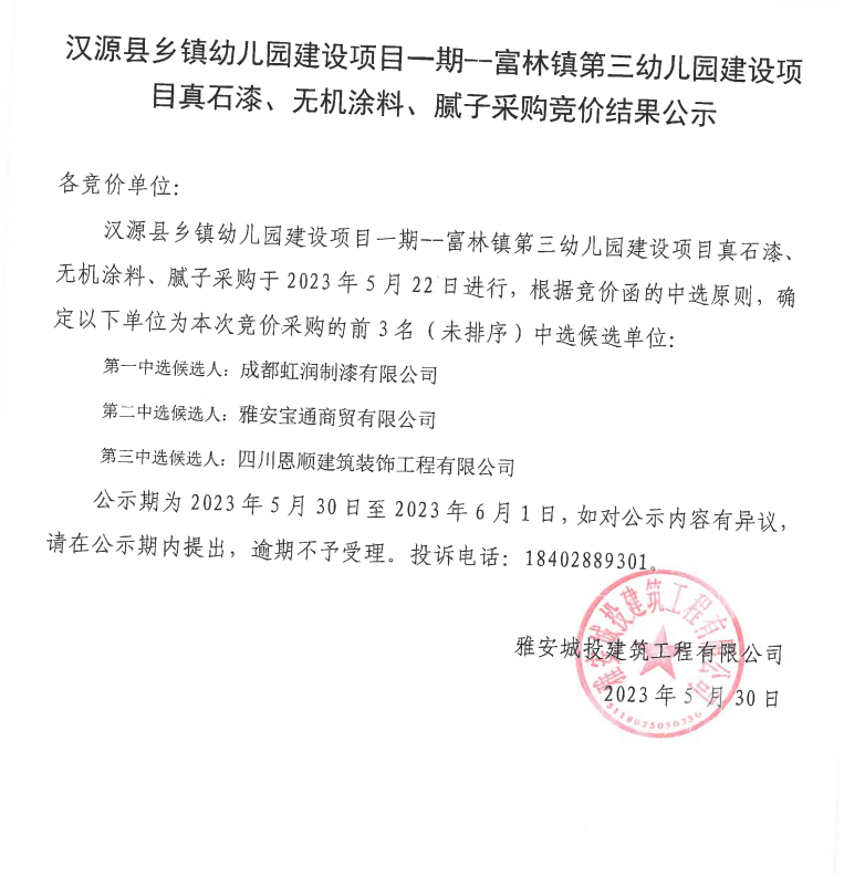 漢源縣鄉(xiāng)鎮(zhèn)幼兒園建設(shè)項(xiàng)目一期--富林鎮(zhèn)第三幼兒園建設(shè)項(xiàng)目真石漆、無機(jī)涂料、膩?zhàn)硬少徃們r(jià)結(jié)果公示
