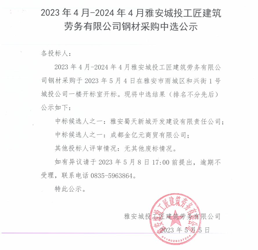 2023年4月-2024年4月雅安城投工匠建筑勞務(wù)有限公司鋼材采購(gòu)中選公示