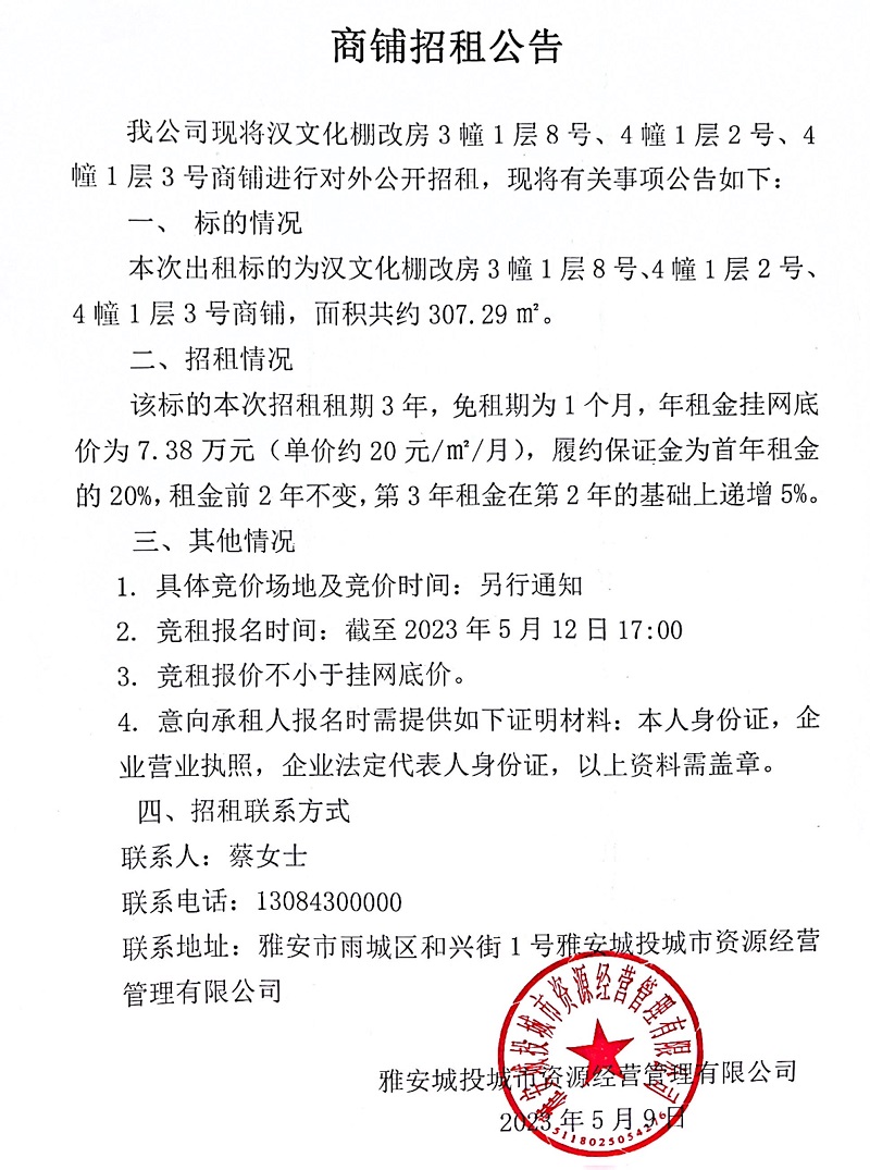 漢文化棚改房3幢1層8號(hào)、4幢1層2號(hào)、4幢1層3號(hào)商鋪招租公告